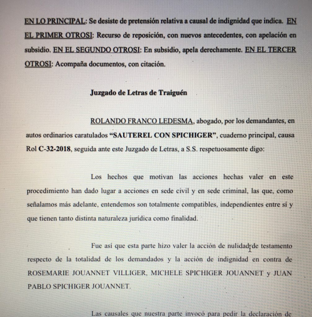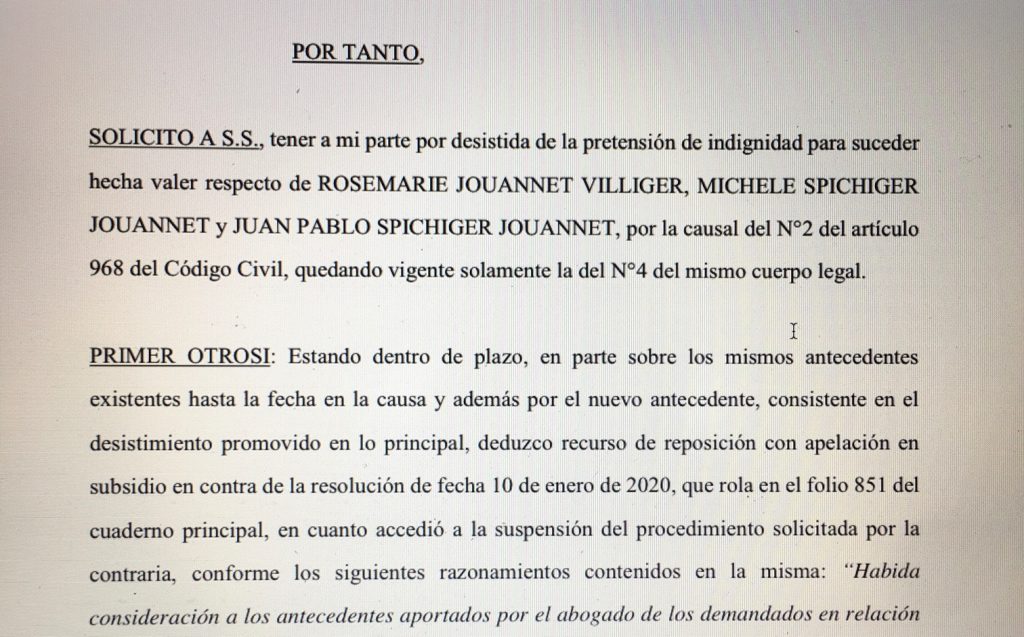 Con fecha 16 de enero de 2020 el abogado de Errol Jouannet, Jorge Luchsinger y Alberto Ruff ingresaron un escrito desistiéndose de una de las causales de indignidad invocadas en su demanda, para apropiarse de los bienes legados a la señora Rosemarie Jouannet y sus hijos, por la señora Lidia Villiger.